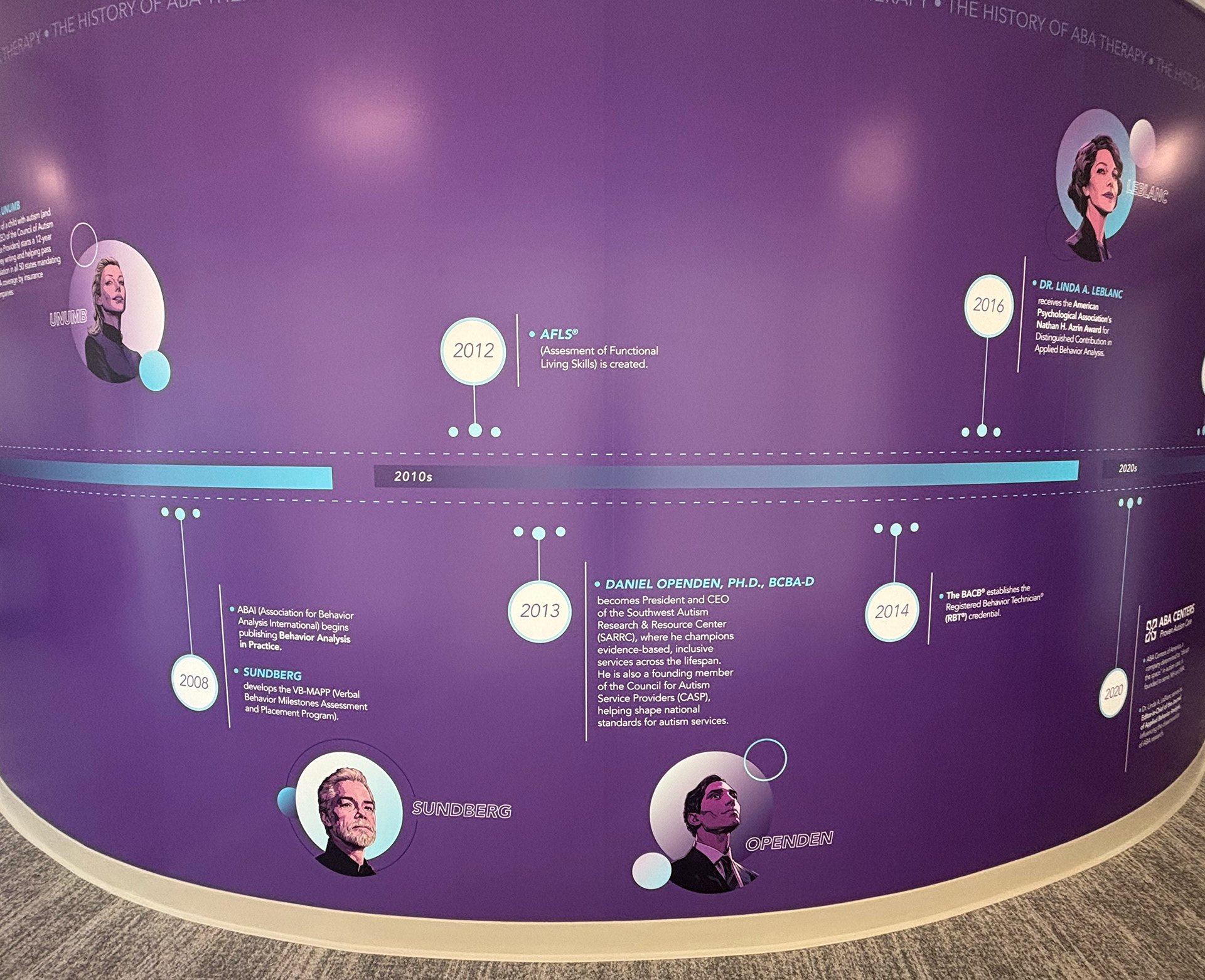 One of my most meaningful explorations with AI in design was the creation of a large-scale timeline mural installed on the 23rd floor of ABA Centers HQs. The project, which took nearly nine months and multiple rounds of edits, was commissioned to illustrate the history of ABA therapy and highlight its key authors. To bring this vision to life, I collaborated with AI by using MidJourney to generate portraits and character depictions, while refining the overall design, text, and layout in Illustrator. This process showed me the true value of working with AI in creative projects: it’s not a replacement for the designer, but a powerful collaborator. When handled thoughtfully, AI can spark exploration, accelerate iteration, and deliver results that feel both innovative and human—just as this mural demonstrates.
